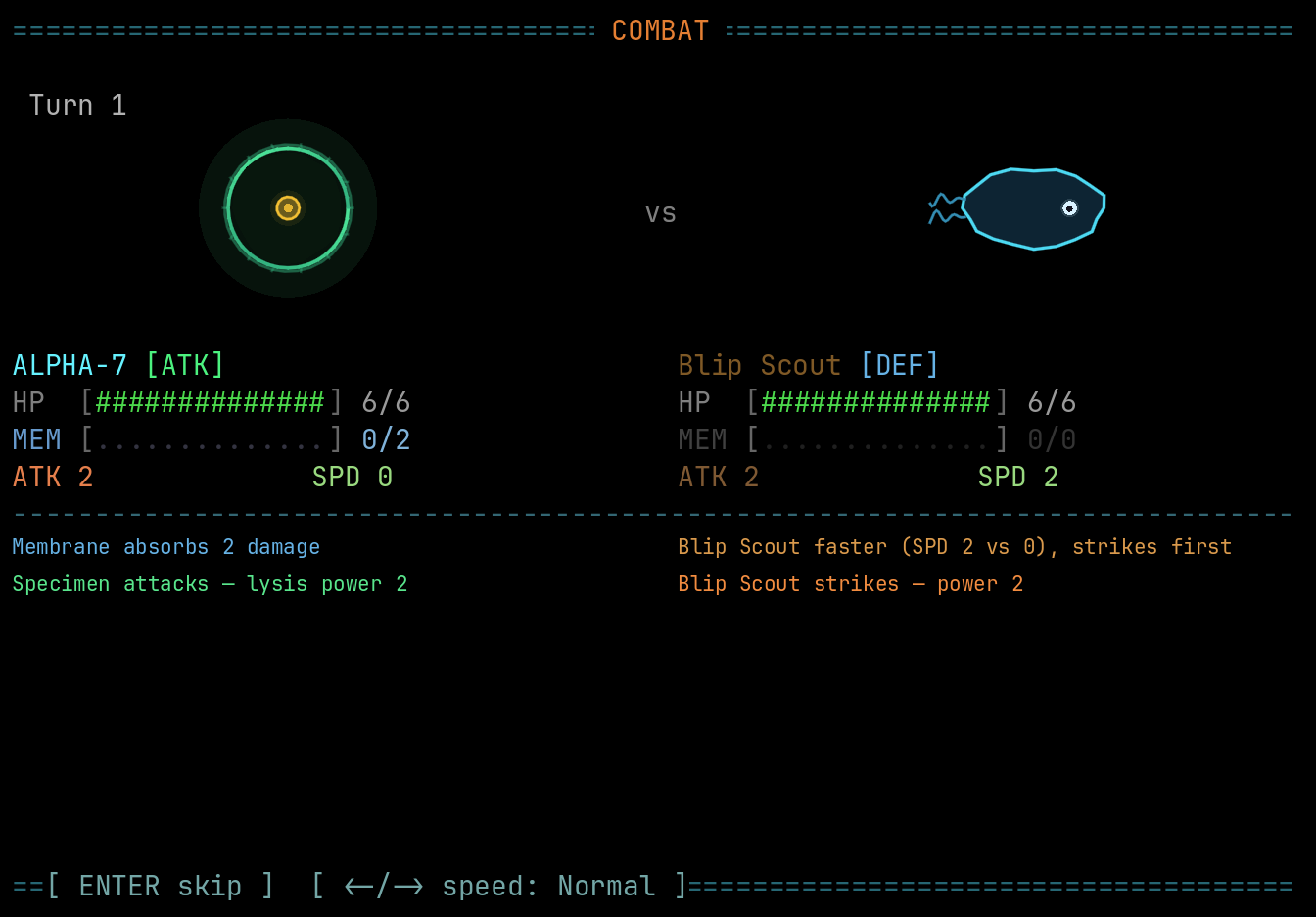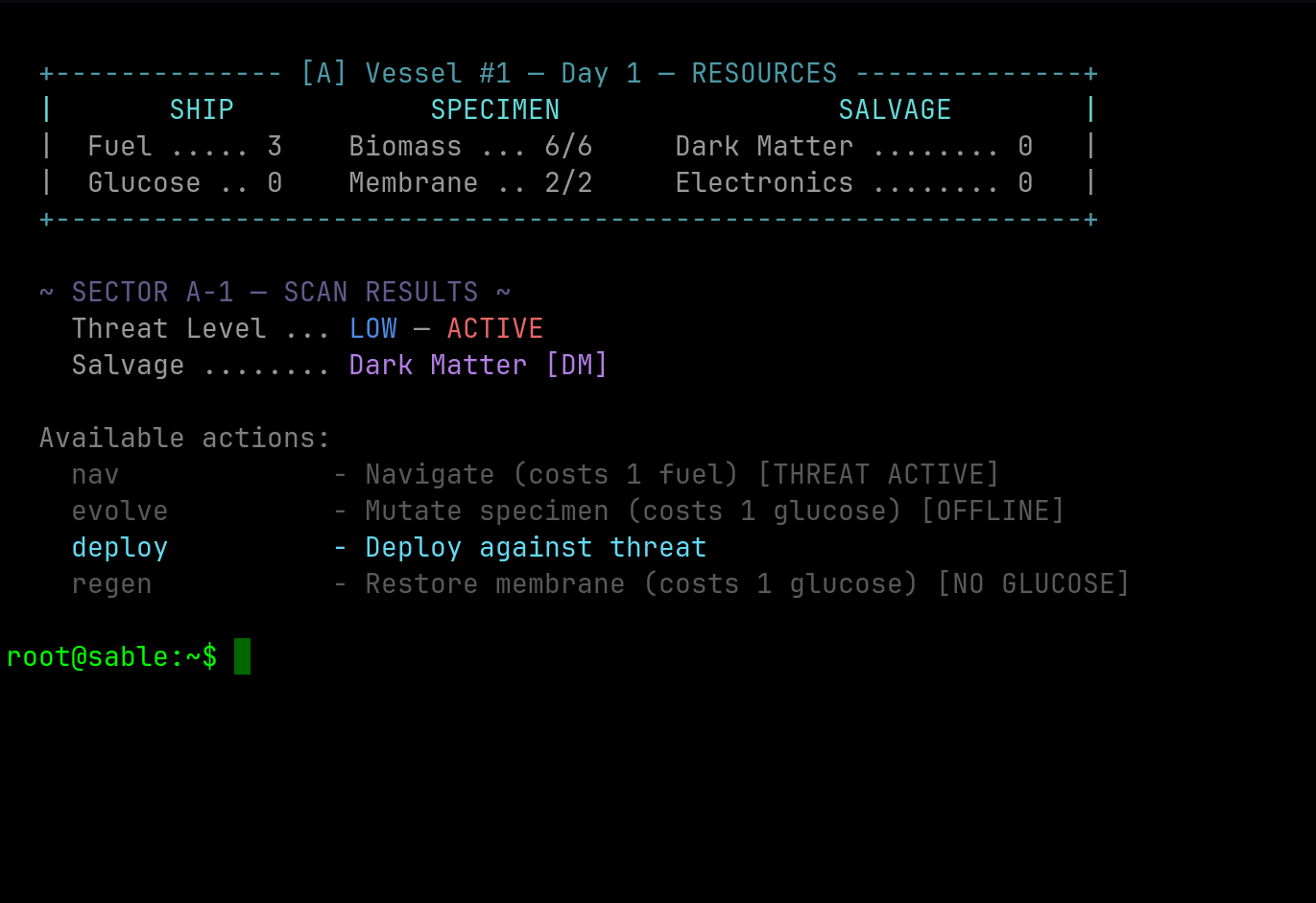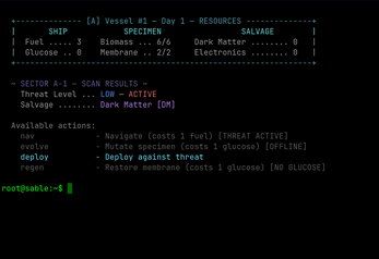 Save humanity by building up the most sophisticated biological specimen possible through upgrades and mutations. Use your specimen to eliminate alien threats and navigate through 4 different star systems. Play through the onboard terminal-based "SABLE" computer, in a retro 80s sci-fi immersive atmosphere.